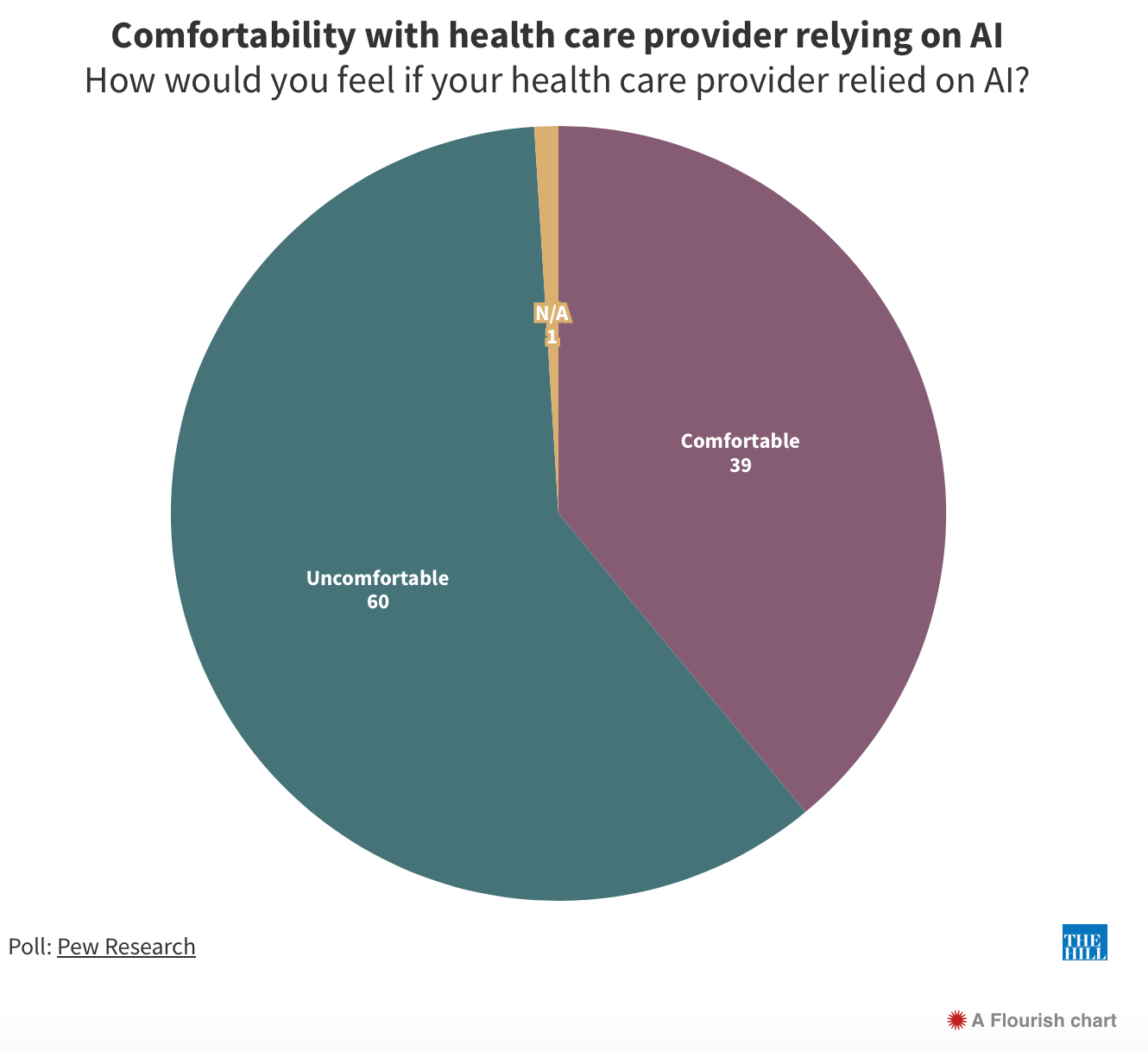 A majority of Americans in a new poll say they’d be uncomfortable with their health care provider relying on artificial intelligence (AI) as part of their medical care, and less than half think using AI would lead to better health outcomes. A Pew Research poll released Wednesday found just 39 percent of U.S. adults say they’d feel comfortable with AI as part of their medical care — in practices like screening, diagnosis and treatment — while 60 percent would feel uncomfortable.