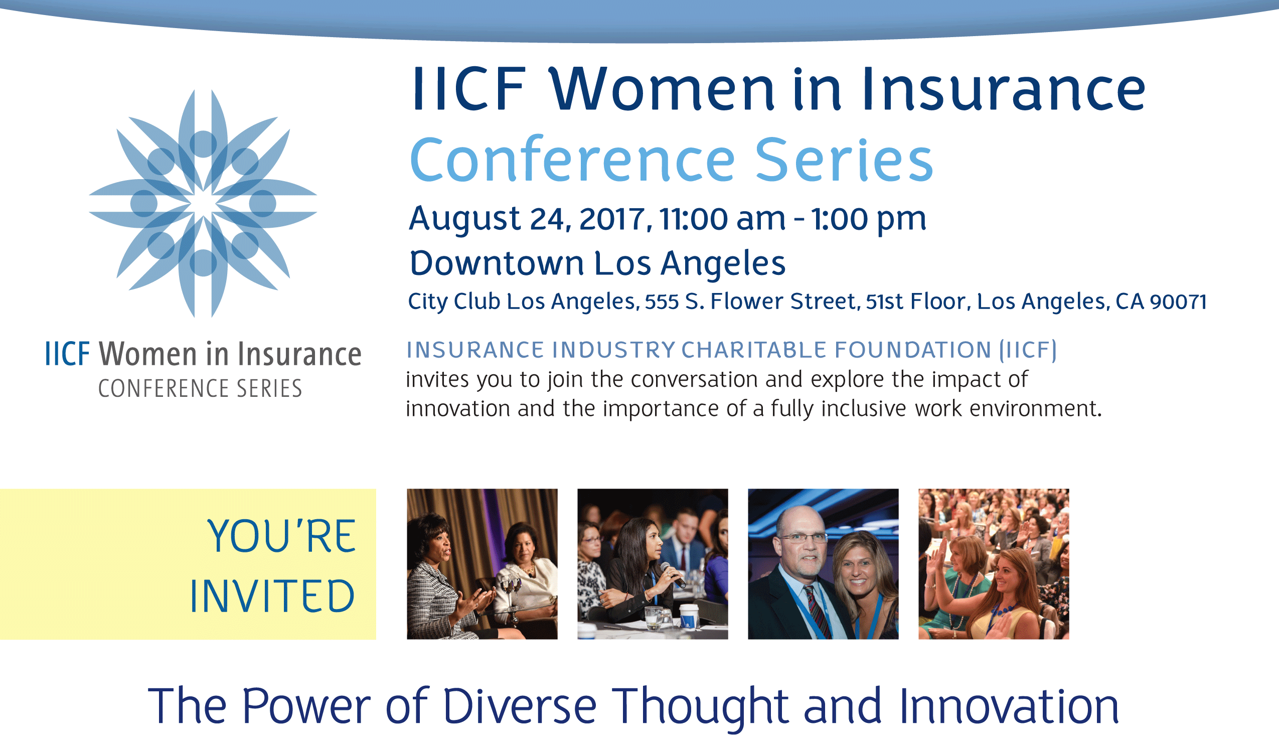 Don’t miss the Insurance Industry Charitable Foundation (IICF) Women in Insurance luncheon at the City Club in downtown Los Angeles August 24, 11am-1pm. The theme is “The Power of Diverse Thought and Innovation.” Admission is $75. Sponsorship opportunities are also available. Register online via the event website.